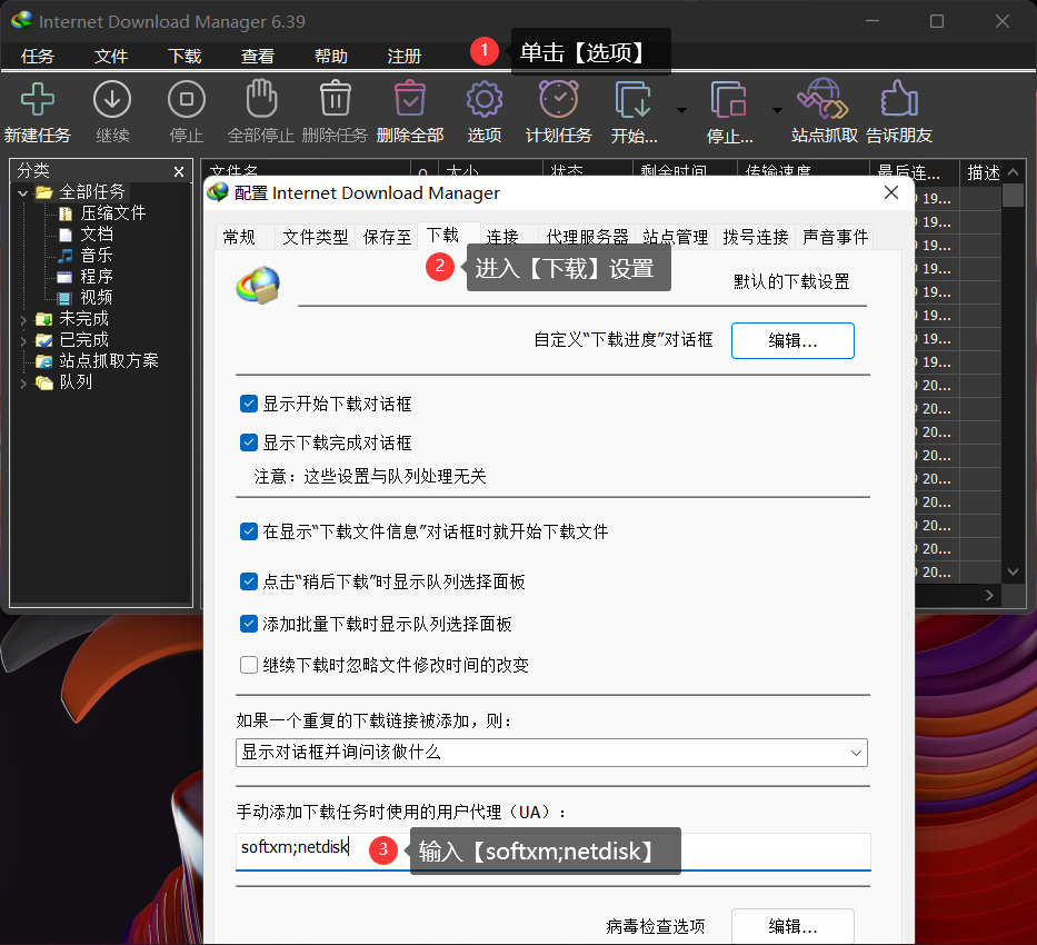 IDM配置:设置4线程及修改UA为 netdisk或者softxm;netdisk