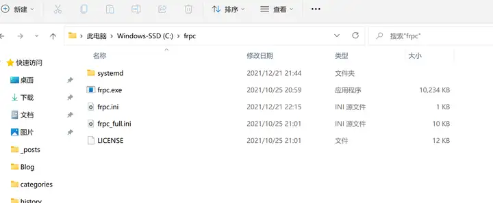 下载frps客户端文件: https://github.com/fatedier/frp/releases 选择frp_0.38.0_windows_amd64.zip 64位文件(选最新的) 然后解压,把frpc.exe和frpc.ini拷贝至c盘,目录结构如下图所示,当然你拷贝至其他盘也是一样的,看个人喜好